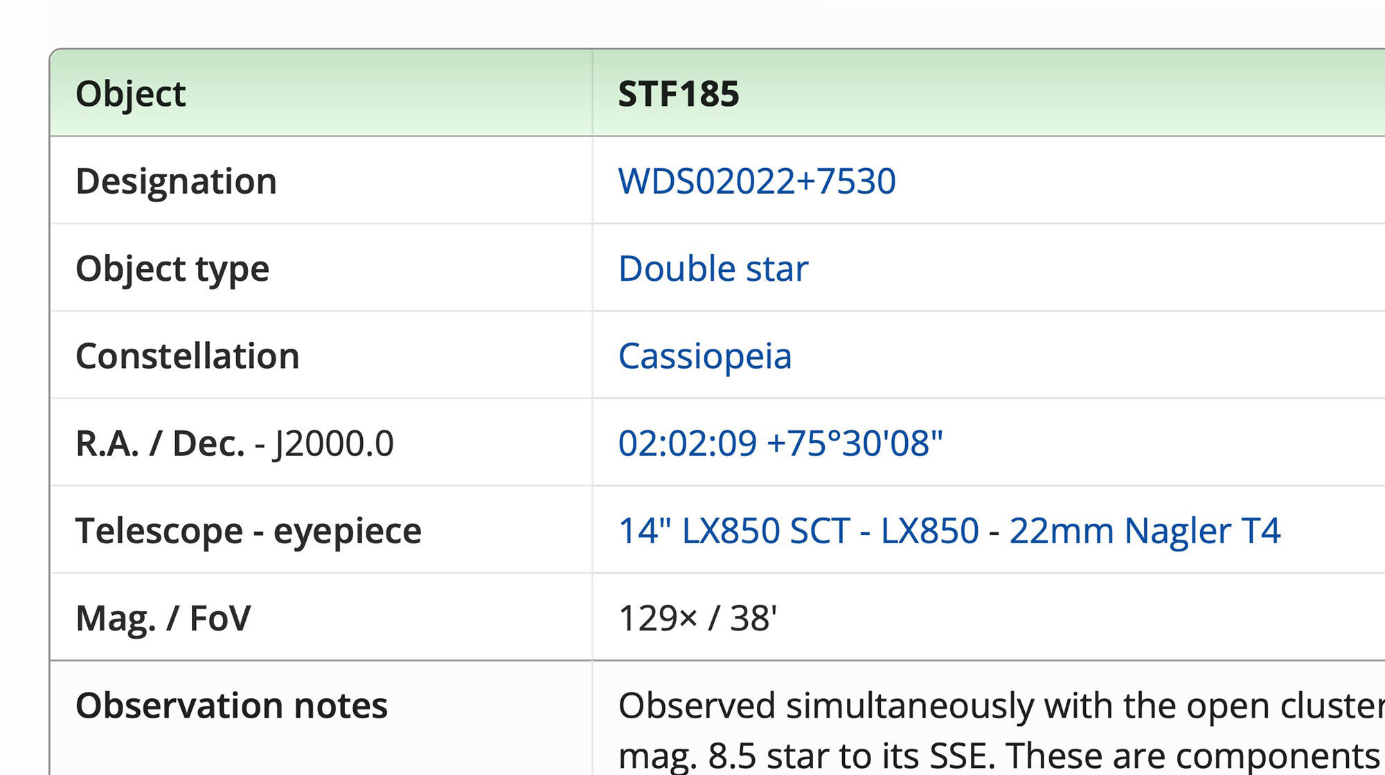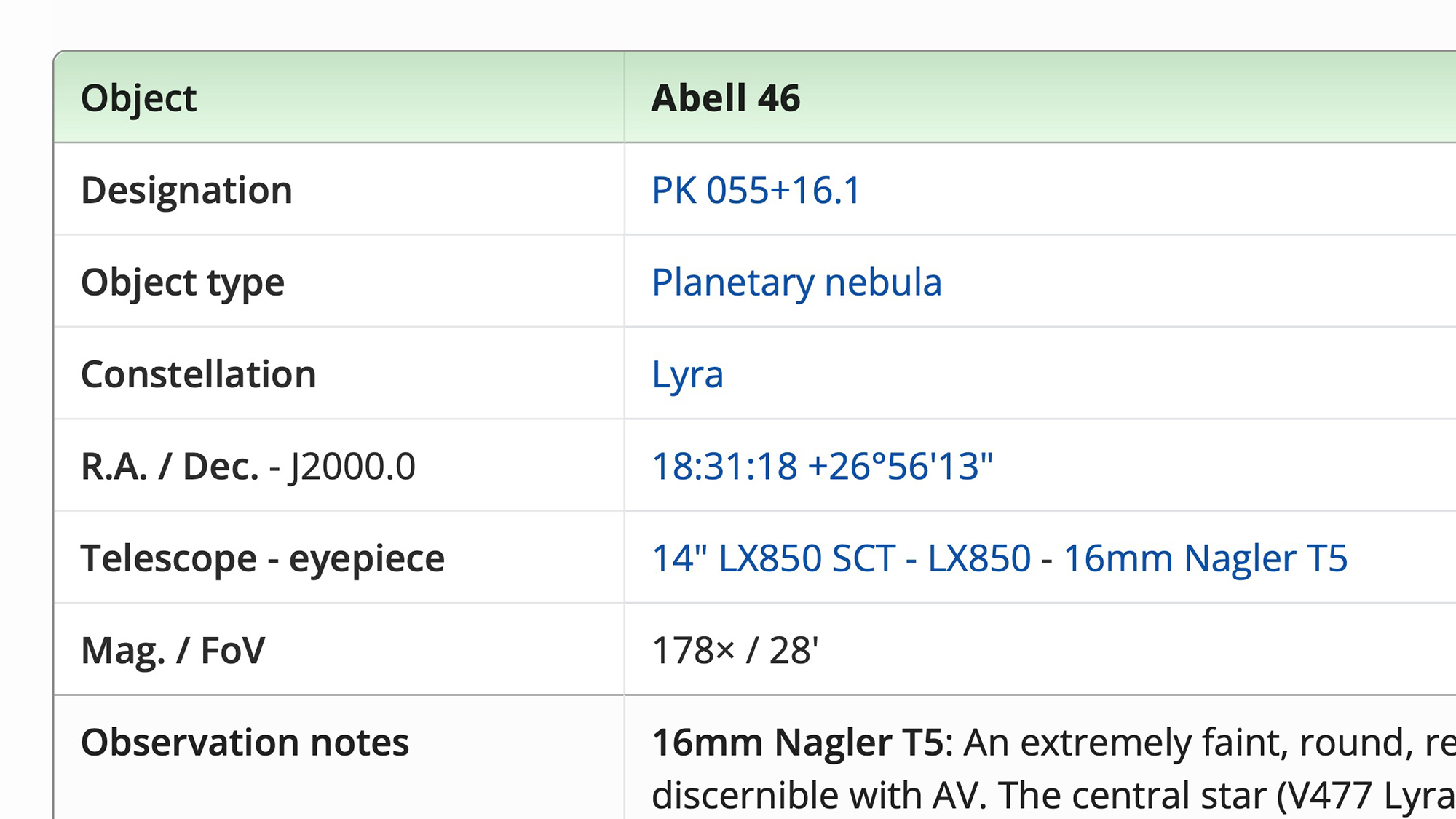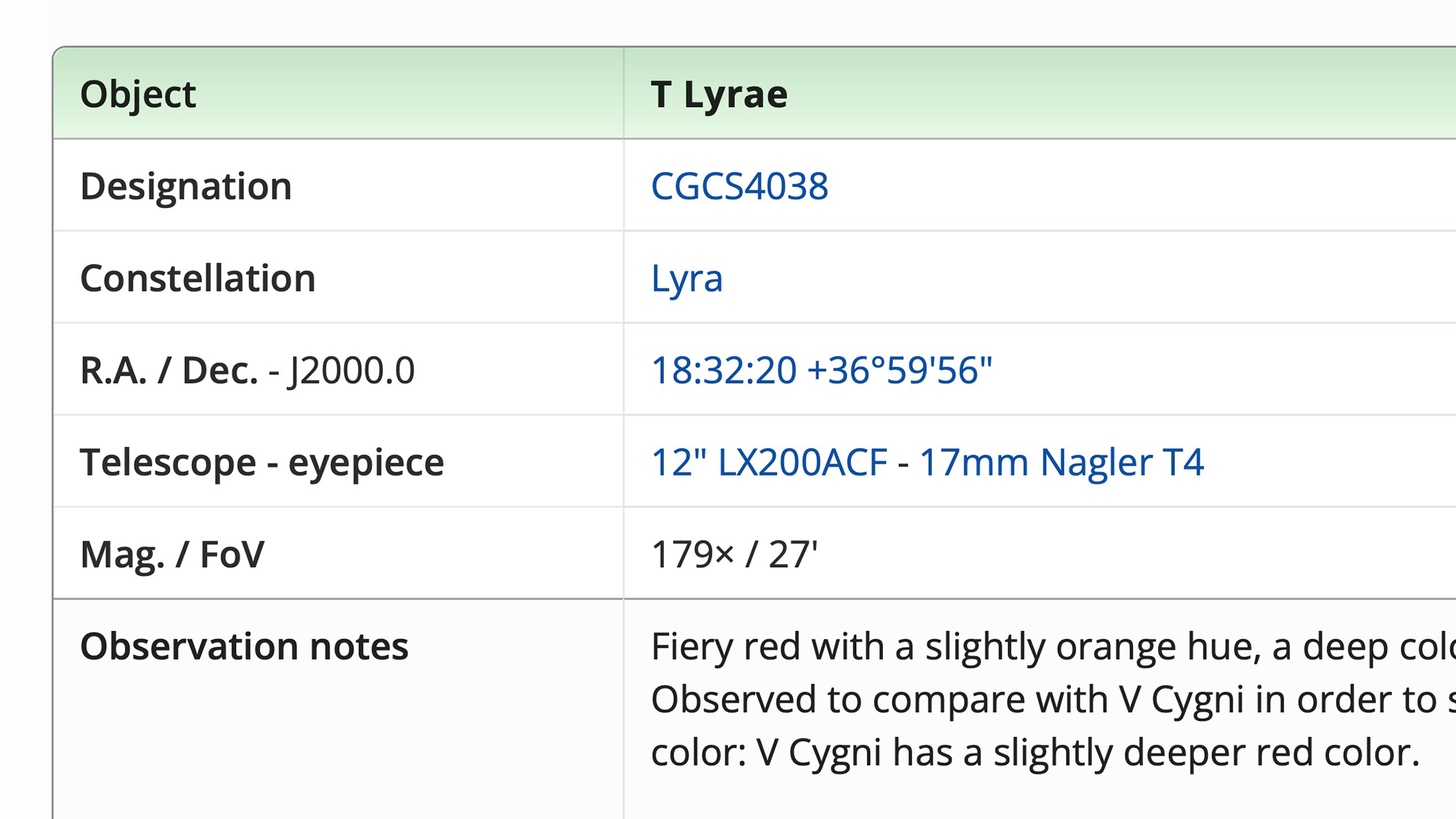 Click the date & time of the observation for the corresponding observing session. Click an object's coordinate to view it in Aladin. For double stars, clicking the WDS designation takes you to Stelledoppie. Planetary nebulae PK, PN G & IRAS designations link to SIMBAD, as do carbon star CGCS designations. Other links are provided for object categories, the constellation in which an object is located, the telescope & primary eyepiece/filter combination used for the observation and the observing site.