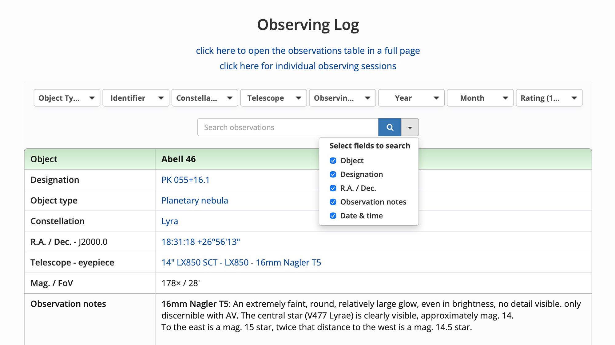 Observations can also be viewed in a full page table, for individual years and sessions and separately for carbon stars, open clusters, globular clusters, nebulae, planetary nebulae, supernova remnants, galaxies & double stars.